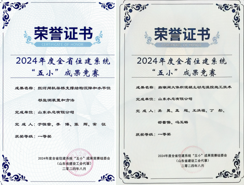 近日,由山东省建设建材工会和山东省建设科技与教育协会组织的2024年度全省住建系统“五小”成果竞赛发布获奖名单,万搏球赛_万搏(中国) 申报的《挡潮闸大体积混凝土动态温控施工技术》、《拦河闸机架桥支撑结构沉降和水平位移检测装置和方法》等8项创新成果分别荣获一等奖2项,二等奖2项,三等奖4项。