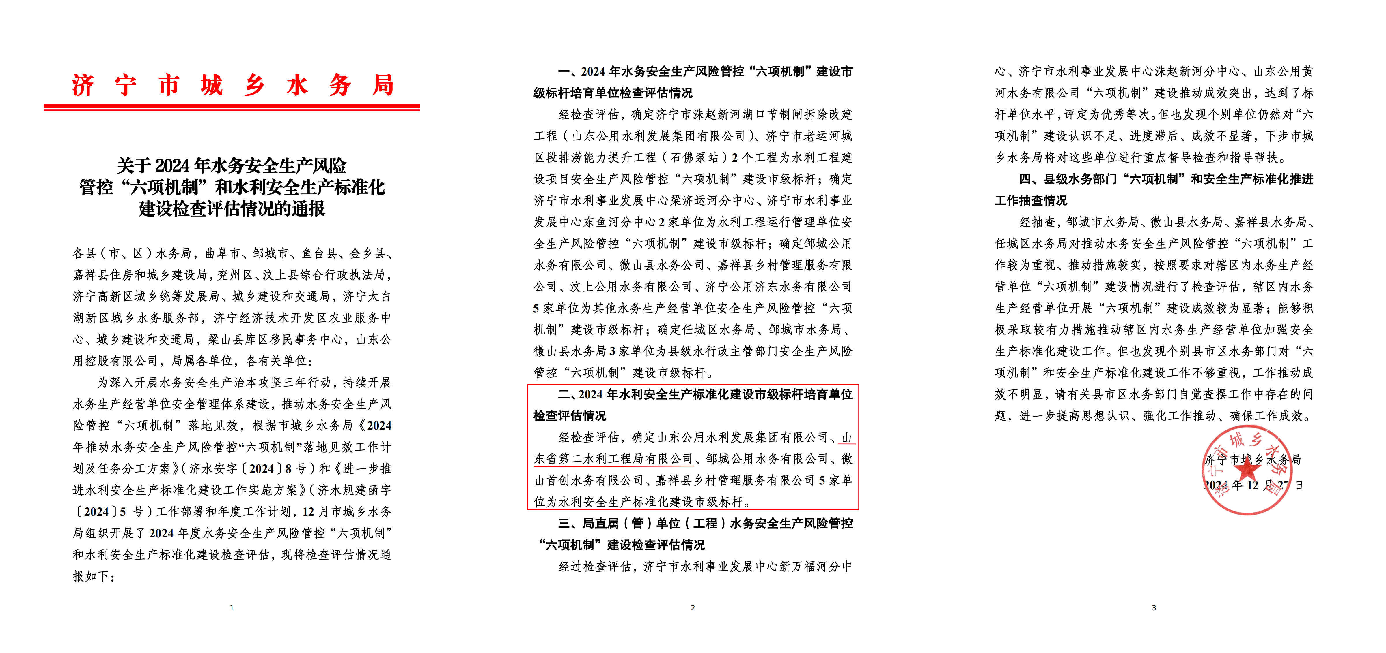 近日,济宁市城乡水务局公布了2024 年水务安全生产风险管控“六项机制”和水利安全生产标准化建设检查评估情况,经检查评估,二局有限万搏球赛_万搏(中国) 被评为水利安全生产标准化建设市级标杆企业。