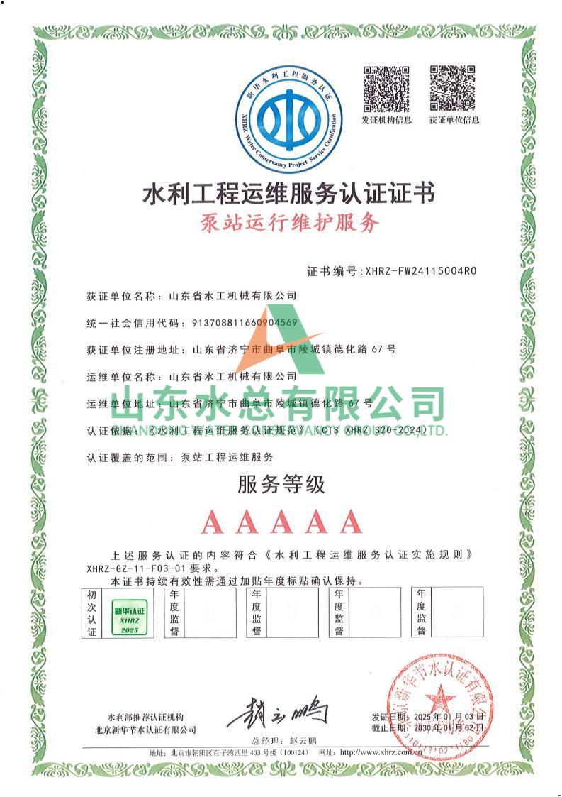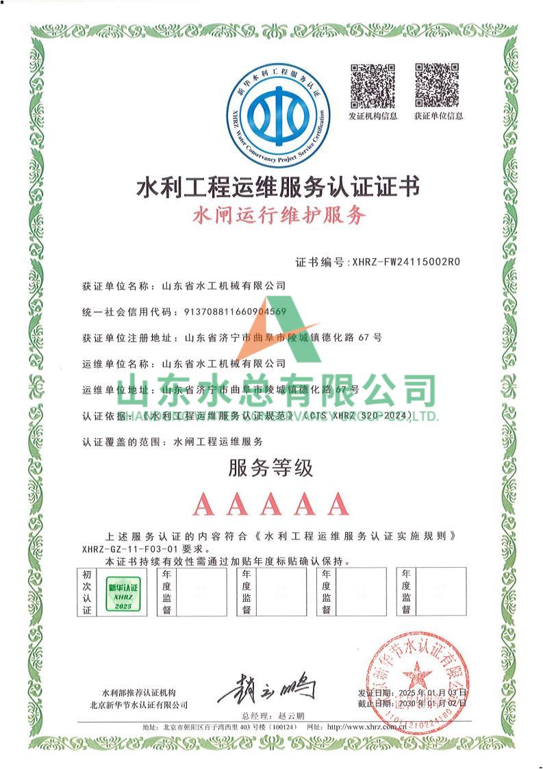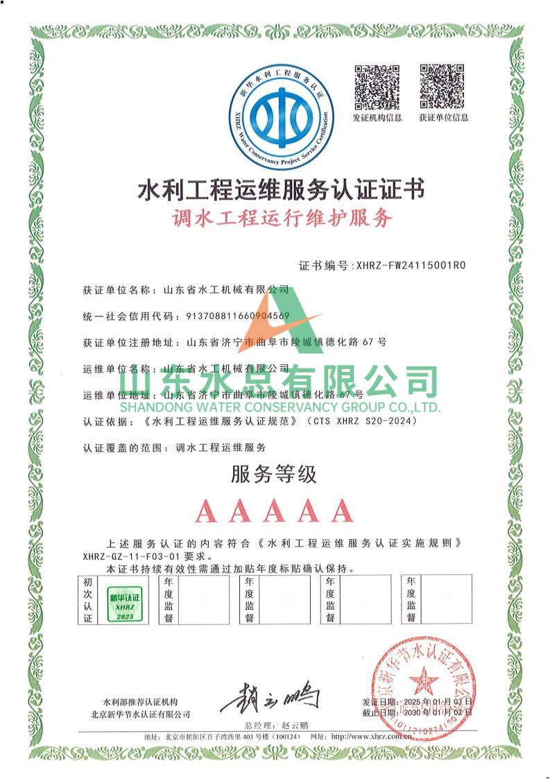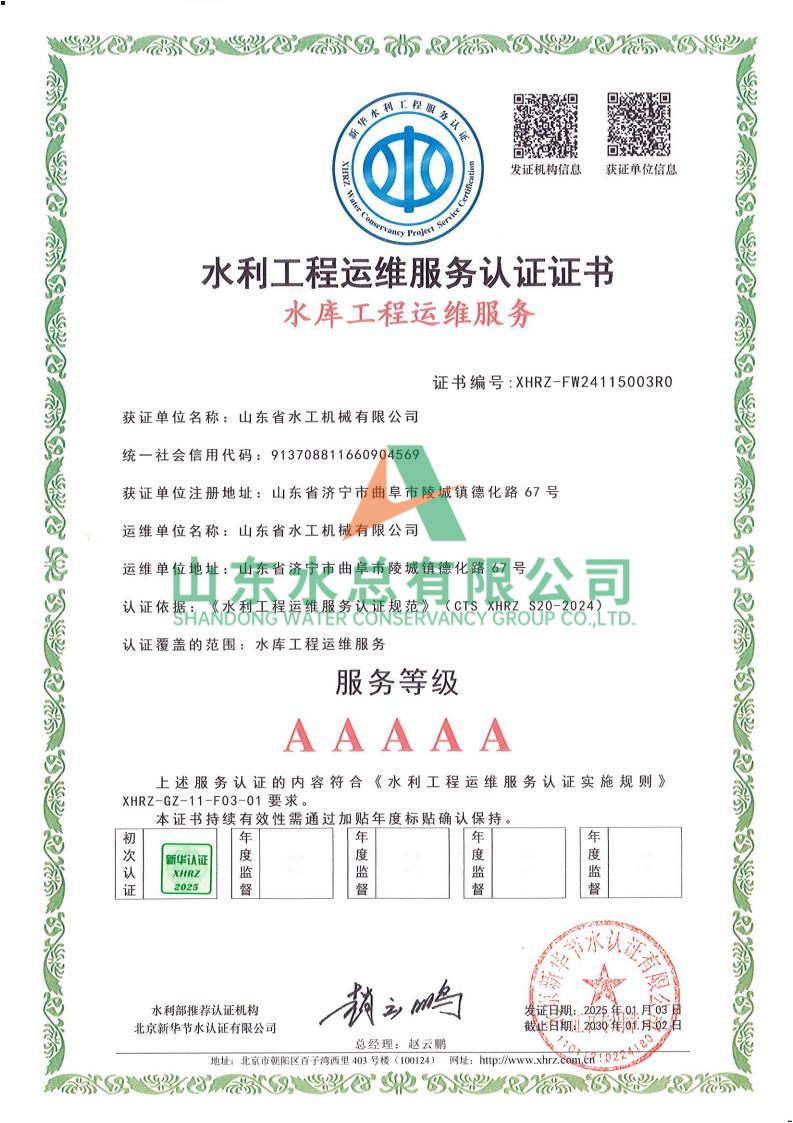 一直以来,水工机械万搏球赛_万搏(中国) 高度重视水利工程运维服务的质量与专业性,在人员配备、技术应用、管理体系等多方面精心打磨。在认证过程中,历经严格审核,万搏球赛_万搏(中国) 凭借扎实的运维实力、规范的服务流程以及对水利工程运维高规格的执行标准,赢得了认可。