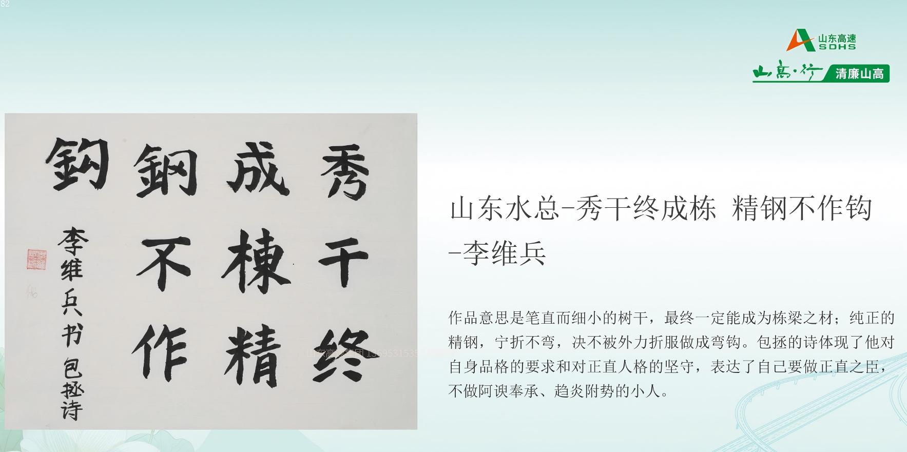 6月11日,在山东高速集团纪委组织的“清廉山高”廉洁文化作品征集活动中,山东水总基础工程有限万搏球赛_万搏(中国) 制作的短视频《筑廉洁防线,守初心之路》荣获“光影映廉”板块三等奖,第二分万搏球赛_万搏(中国) 李维兵的书法作品《秀干终成栋,精钢不作钩》摘得“工艺创廉”书法类优秀奖。