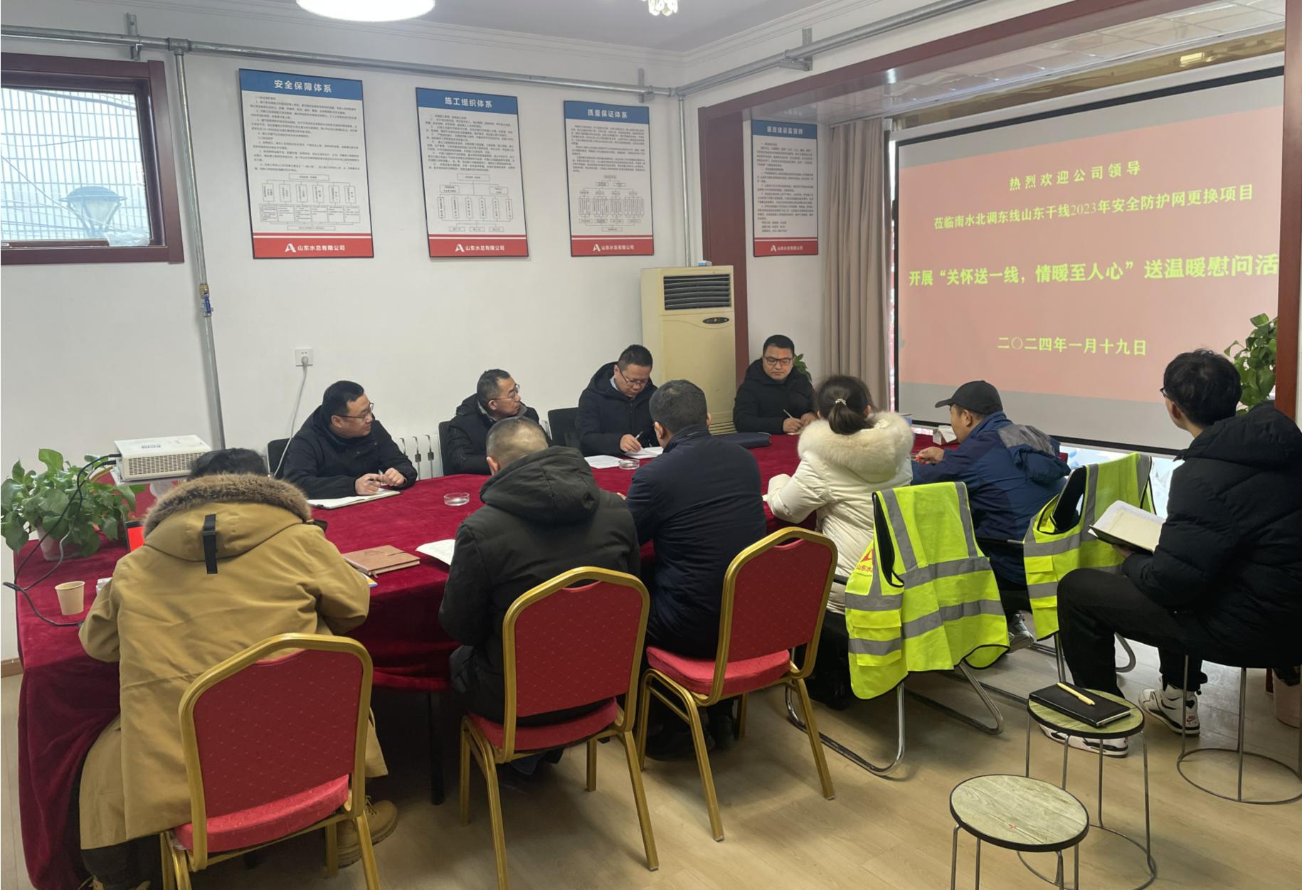 1月19日,万搏球赛_万搏(中国) 党委委员、副总经理袁英杰,工程管理部相关人员一行到南水北调东线山东干线2023年安全防护网更换项目,开展“关怀送一线 情暖至人心”送温暖慰问活动