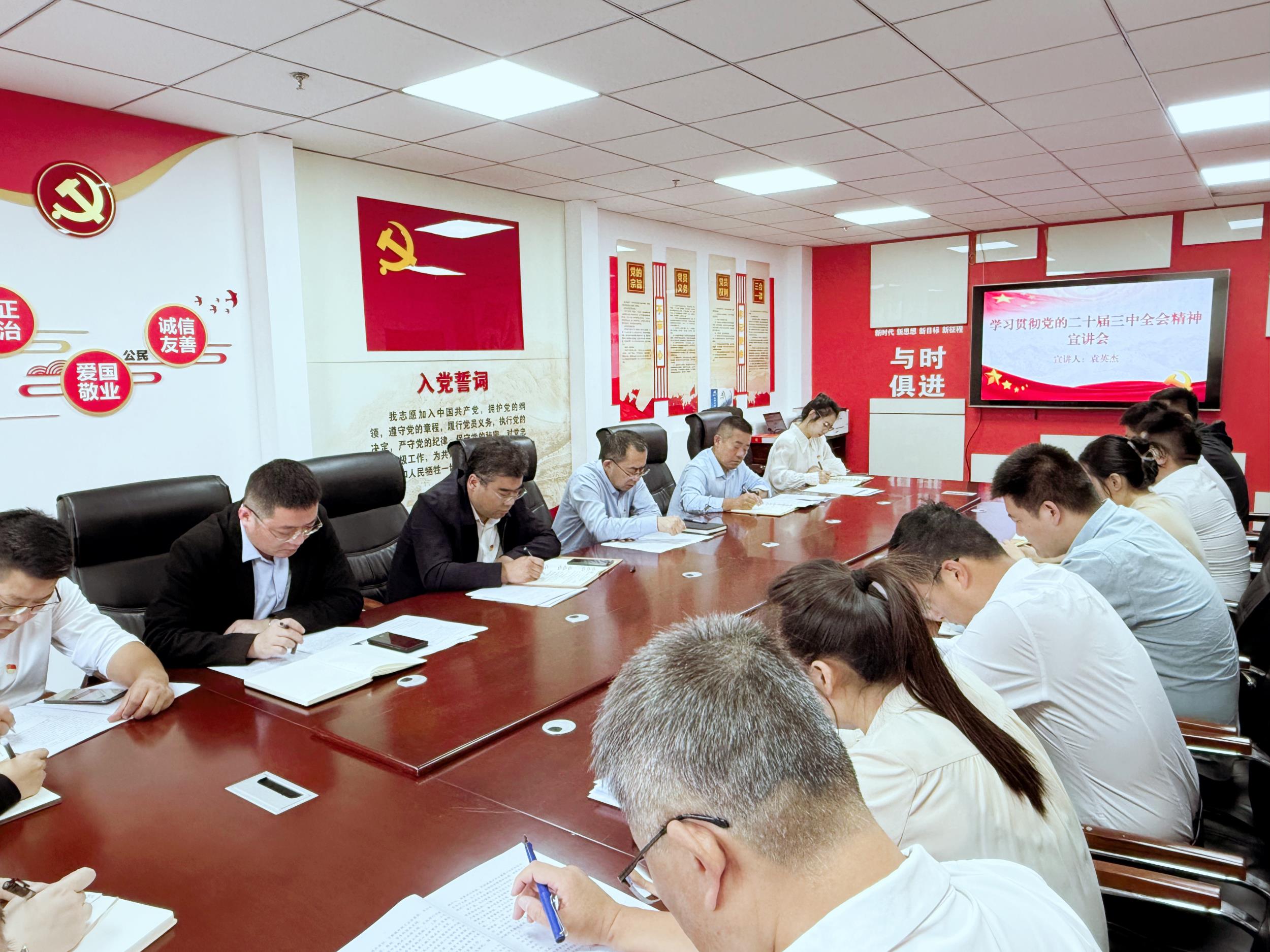 袁英杰以专题党课的形式带领全体党员干部重点学习了《中共中央关于进一步全面深化改革推进中国式现代化的决定》的重大意义和总体要求。同时结合工作实际,从高站位抓学习,高标准抓融合、高质量抓队伍三个方面讲解了如何贯彻落实全会精神,要求大家要坚持融会贯通,把学习宣传贯彻全会精神同开展党纪学习教育紧密结合起来,始终保持“创”的精神、“闯”的劲头、“干”的作风,全力冲刺各项目标任务,以实干业绩检验学习贯彻成效。